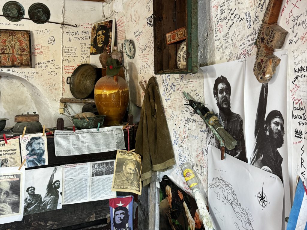 Tucked in a small building on the edge of the cliffs, Kavos is a Cuban bar with an…authentic feel…serving either beer or rum cocktails. Inside, you will find yourself surrounded by old Cuban flags, photos of Fidel Castro, revolution memorabilia, handwritten letters and a crazy amount of empty rum bottles. The owner of Kavos is just as unique as his bar, an older man who shows up every evening to serve customers himself, pouring both you and him a shot with every drink ordered.