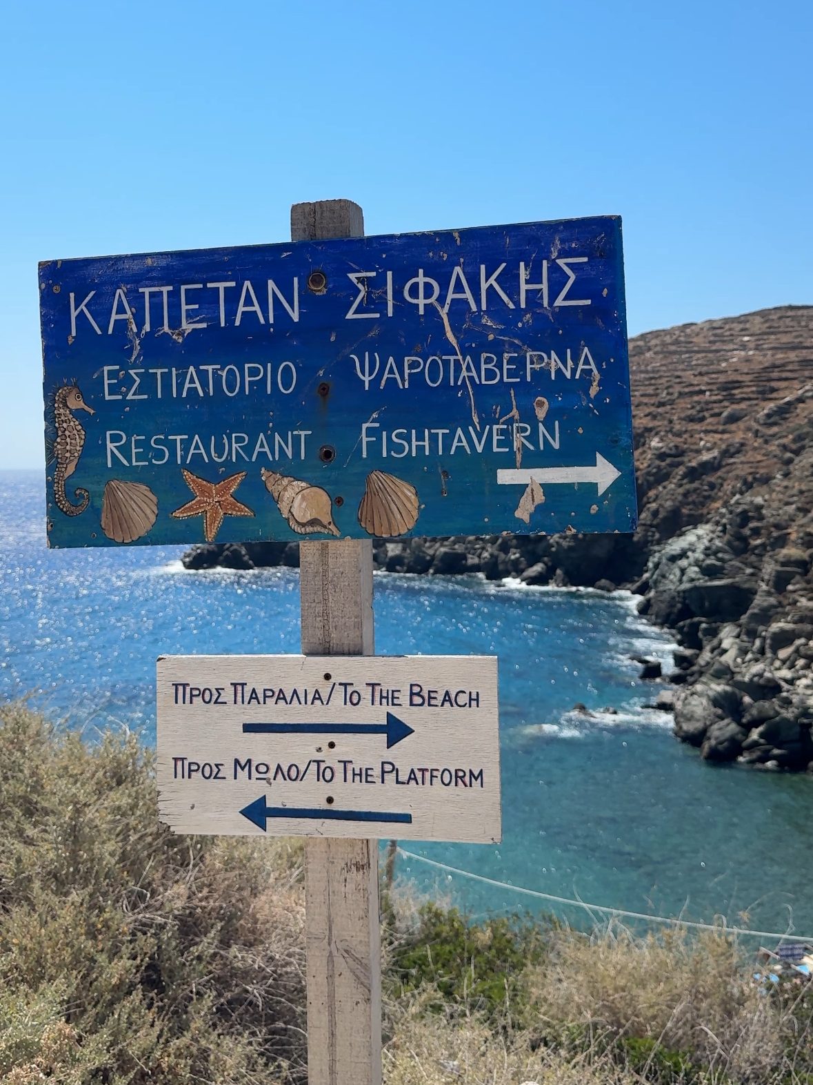 Below the village on the water, there are three beautiful little restaurants: Cantina, Captain Sifakis, and Captain George. All of them being right on the water, all of the seafood is is brought in fresh from the boat that day and put on the menu, paired with a beautiful view with your meal.